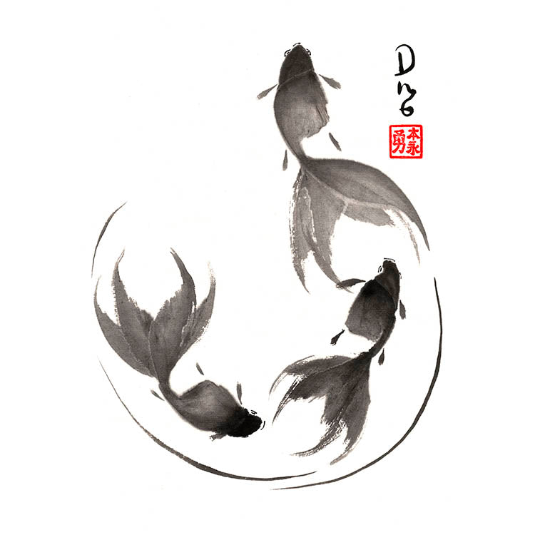 Three goldfish gracefully swim along in tranquil waters. The circular motion evokes of sense of harmony and flow. I really enjoy painting goldfish in this style due to the very simply yet delicate and flowing technique used for their tails.